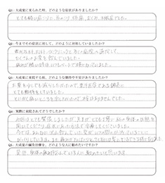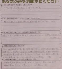 初めは、初めての鍼という事で心配や不安はありましたが、先生も優しく、私が色々な質問をしても答えてくれ、アドバイスをしてくれたのが、私は嬉しく感じました。