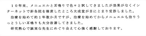 10年来、メニュエルと耳鳴りで色々と試してきましたが効果がなくインターネットで針灸院を検索したところ大成堂が目にとまり受診しました。