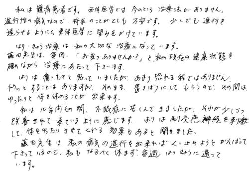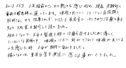 けいれんの顔を見られたくなくマスクが手放せない日々で、特に知人には会いたくありませんでした。それに比べたら針の痛みなんてと(顔に針を刺すと思っていた。)なんとか足を運び、やって来ました。