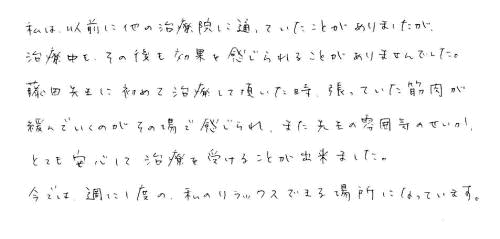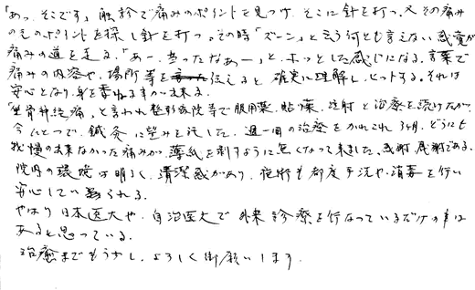 1回1回の治療で何をしても痛かった腰、左足に変化がみられ、毎回大成堂を訪れるのが楽しみでありました。