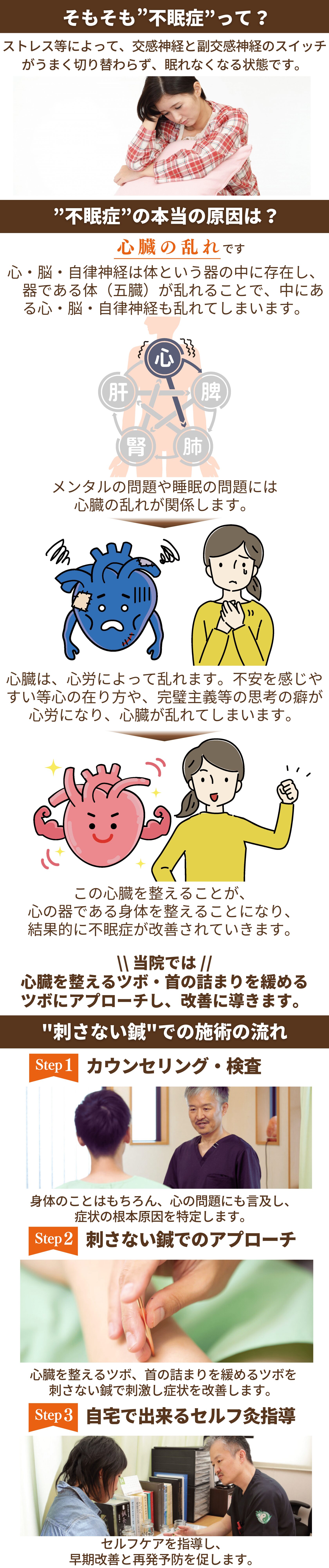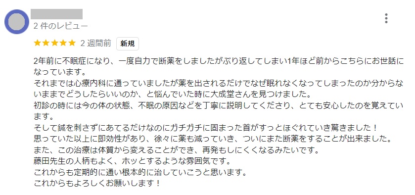 最初は刺さない鍼による不眠治療を疑っていましたが、実際に通ってみるとすぐに効果が表れました。