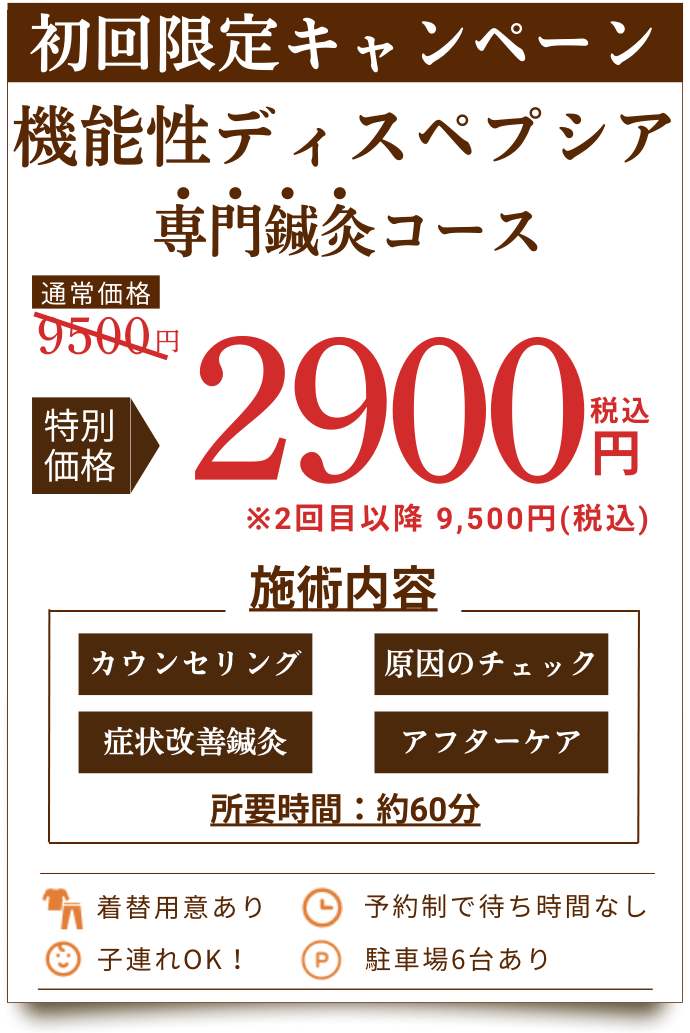 大成堂では、機能性ディスペプシアの胃痛や胃もたれの症状に対して、刺さない鍼で首と背中のトリガーポイント(症状を引き起こす体内のセンサー)をゆるめるアプローチをしていきます。